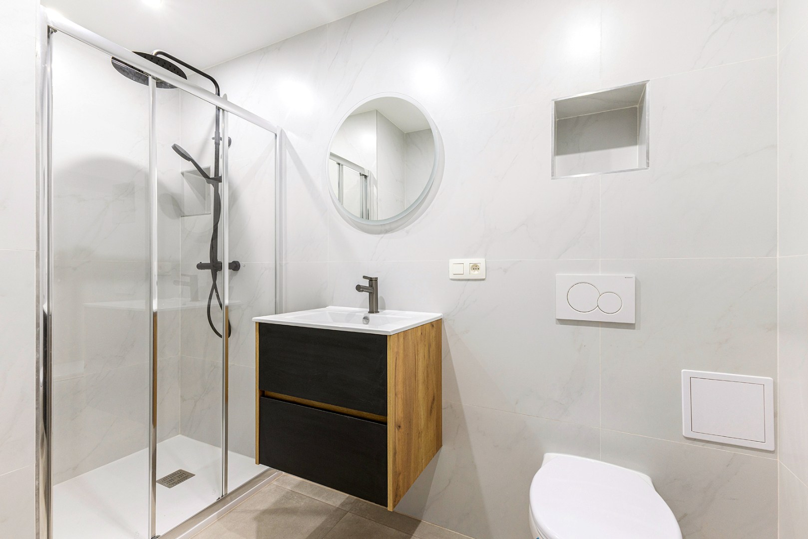 Daarnaast beschikt het appartement over een rustig gelegen slaapkamer achteraan, alsook over een strakke badkamer met douche, wastafel en toilet.