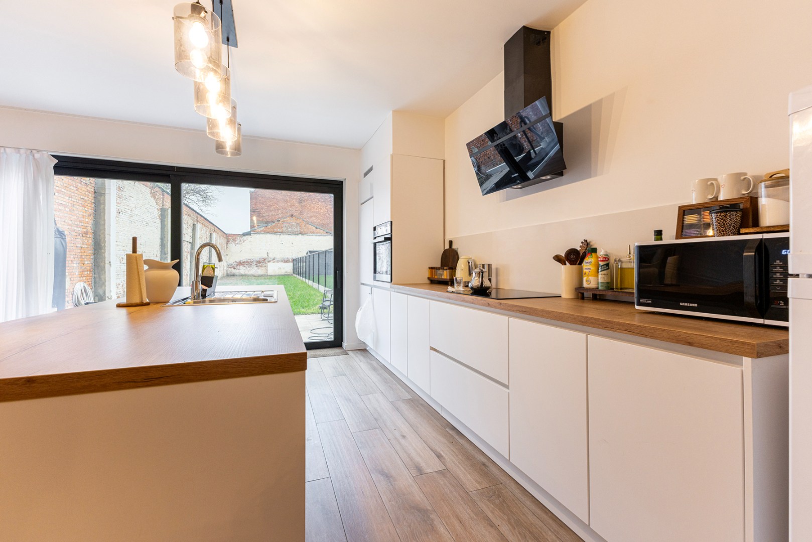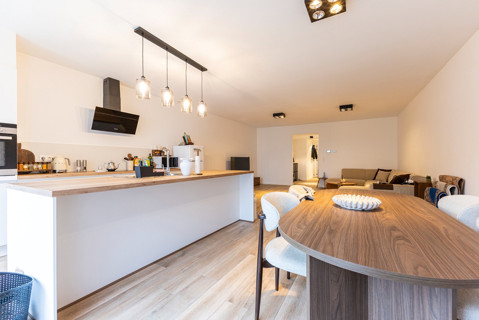 De woonkamer biedt een zee aan ruimte voor een gezellige zithoek, een stijlvolle eethoek en eventuele andere functies die u eraan wilt toebedelen. Vanwege de volledig geïnstalleerde open keuken (uitgerust met de modernste toestellen) vormt de woonkamer het kloppend hart van deze woning.