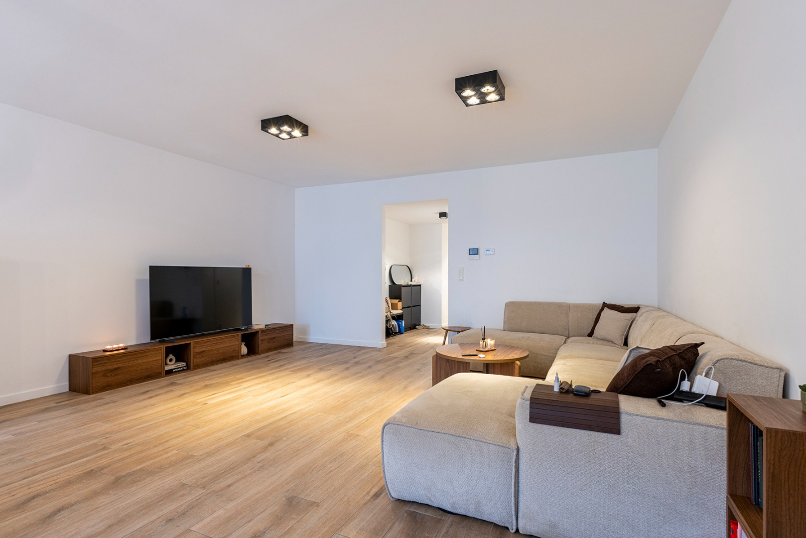 U betreedt dit uitzonderlijke appartement via de praktische afgescheiden inkomhal (met aparte berging en toilet), die achteraan toegang geeft tot de lichtrijke woonkamer met zicht op de prachtige en ruime tuin met het zonovergoten terras.