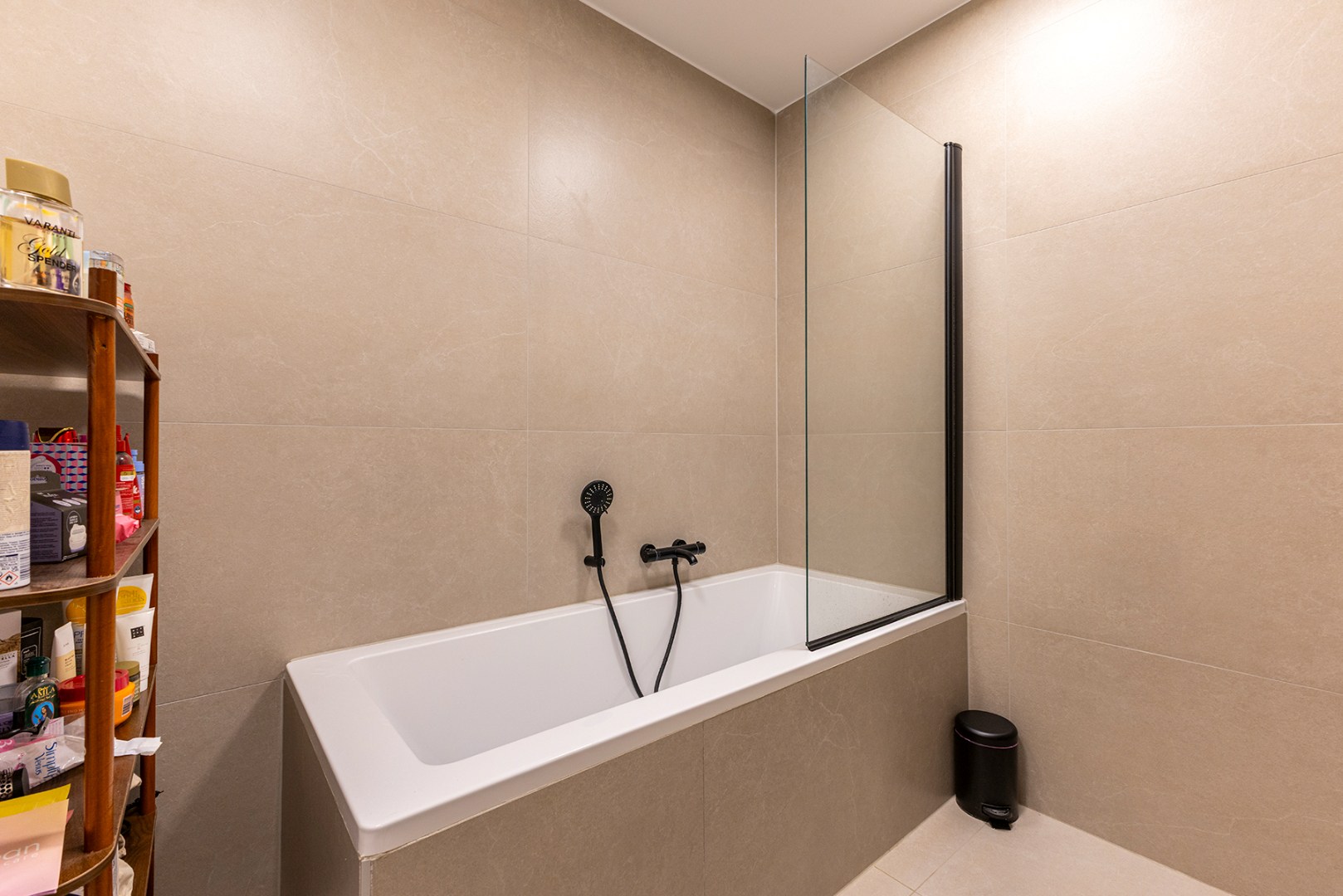 Daarnaast beschikt het appartement over één grote slaapkamer vooraan en een moderne badkamer met bad en douche.