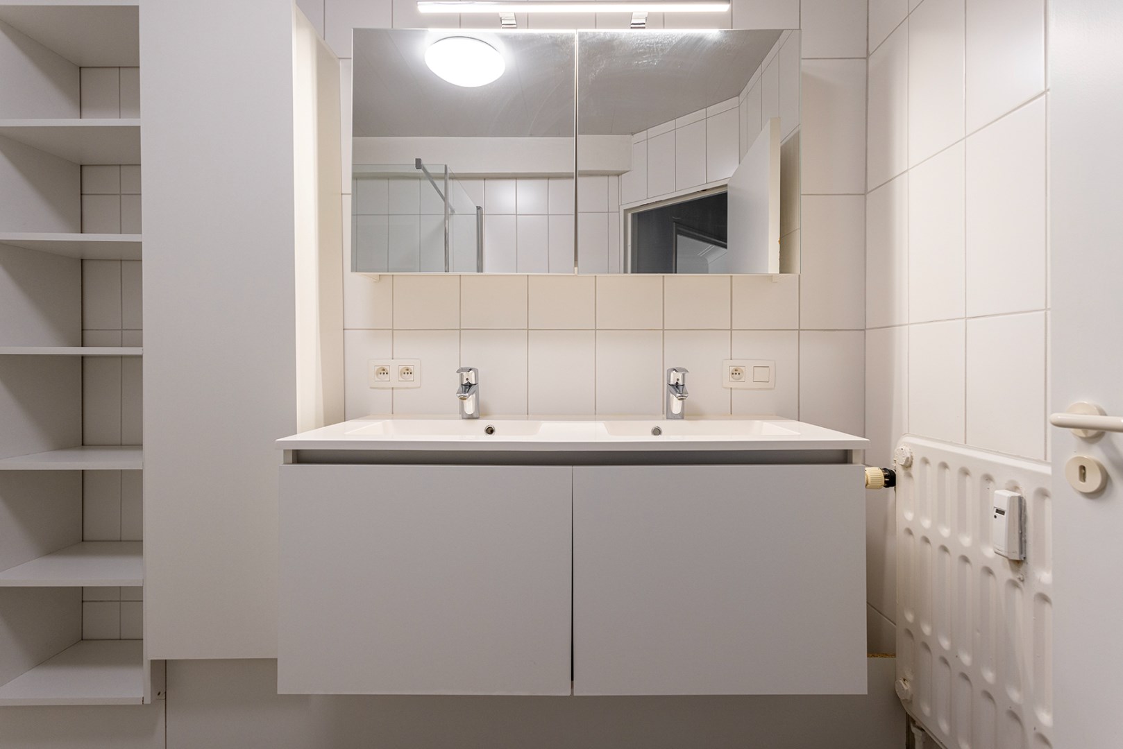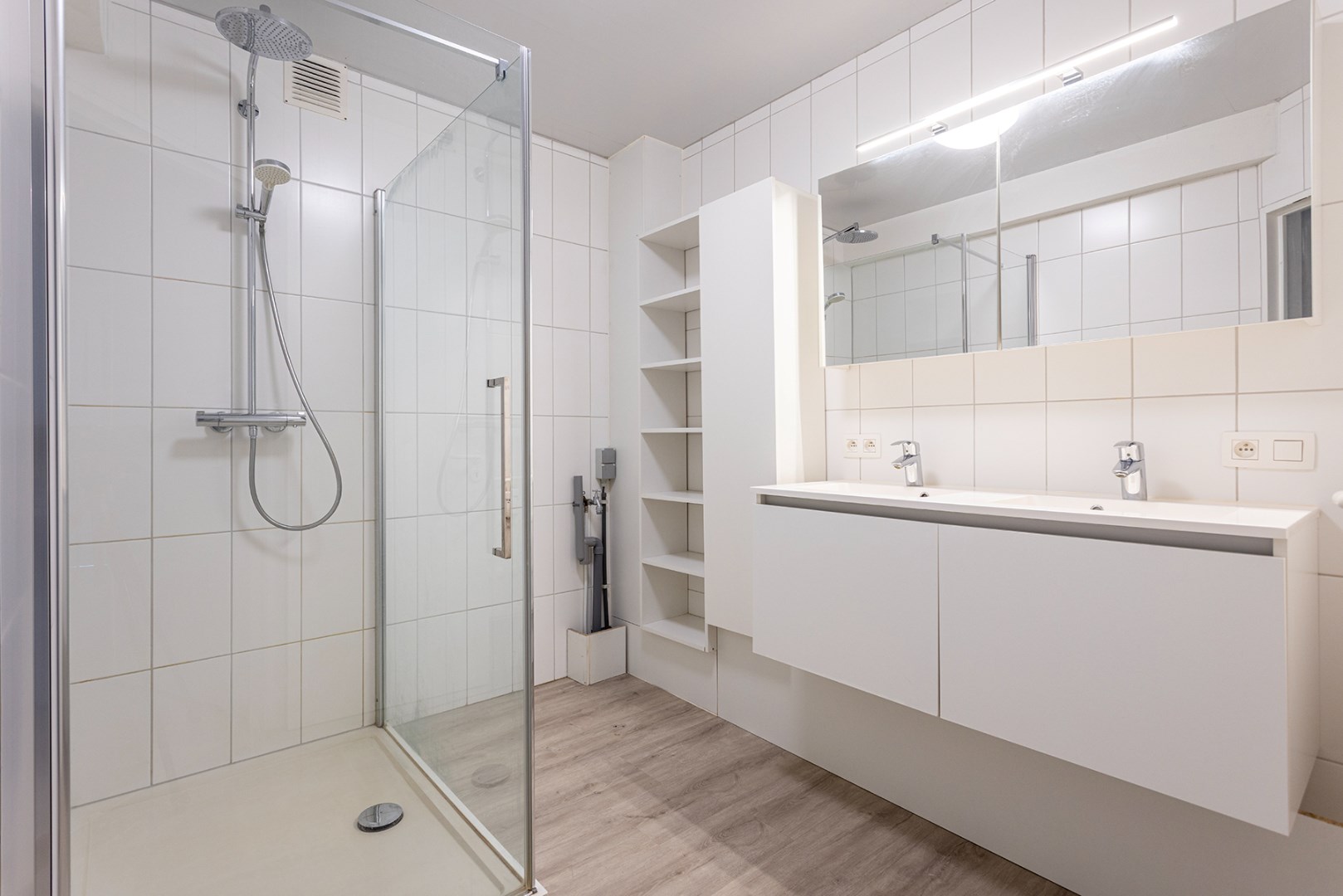 Centraal in het appartement vindt u de moderne badkamer met grote inloopdouche, enkele lavabo met bijhorend meubel, en aansluitingen voor wasmachine en/of droogkast. Het gastentoilet is apart.
