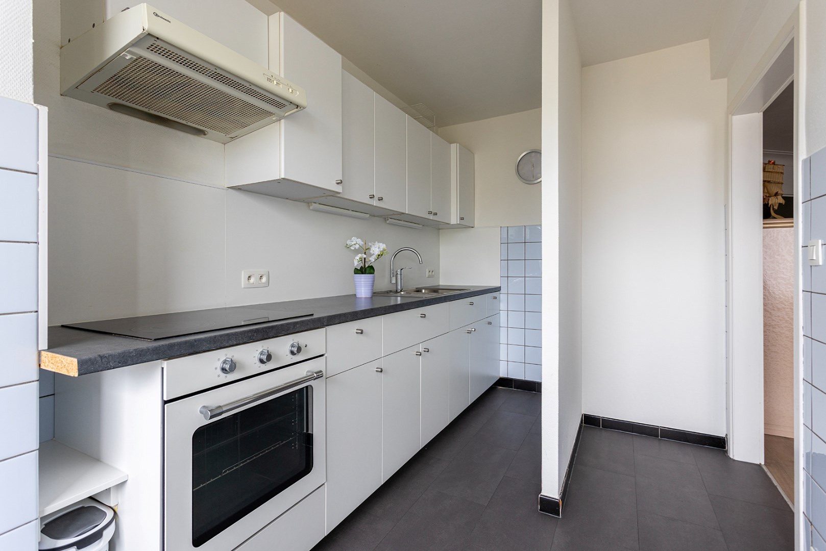 Aansluitend bevindt zich de aparte, functionele keuken met veel bergruimte, voorzien van een kookplaat, dampkap, oven en spoelbak en plaats voor een vrijstaande koelkast.