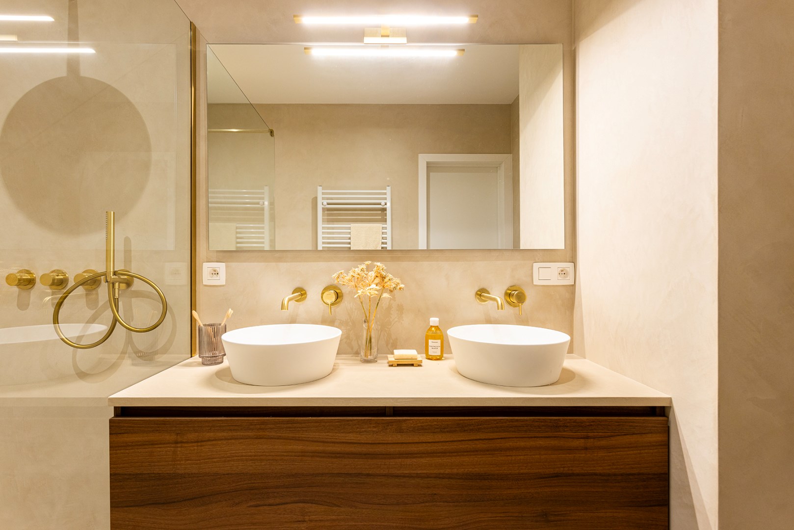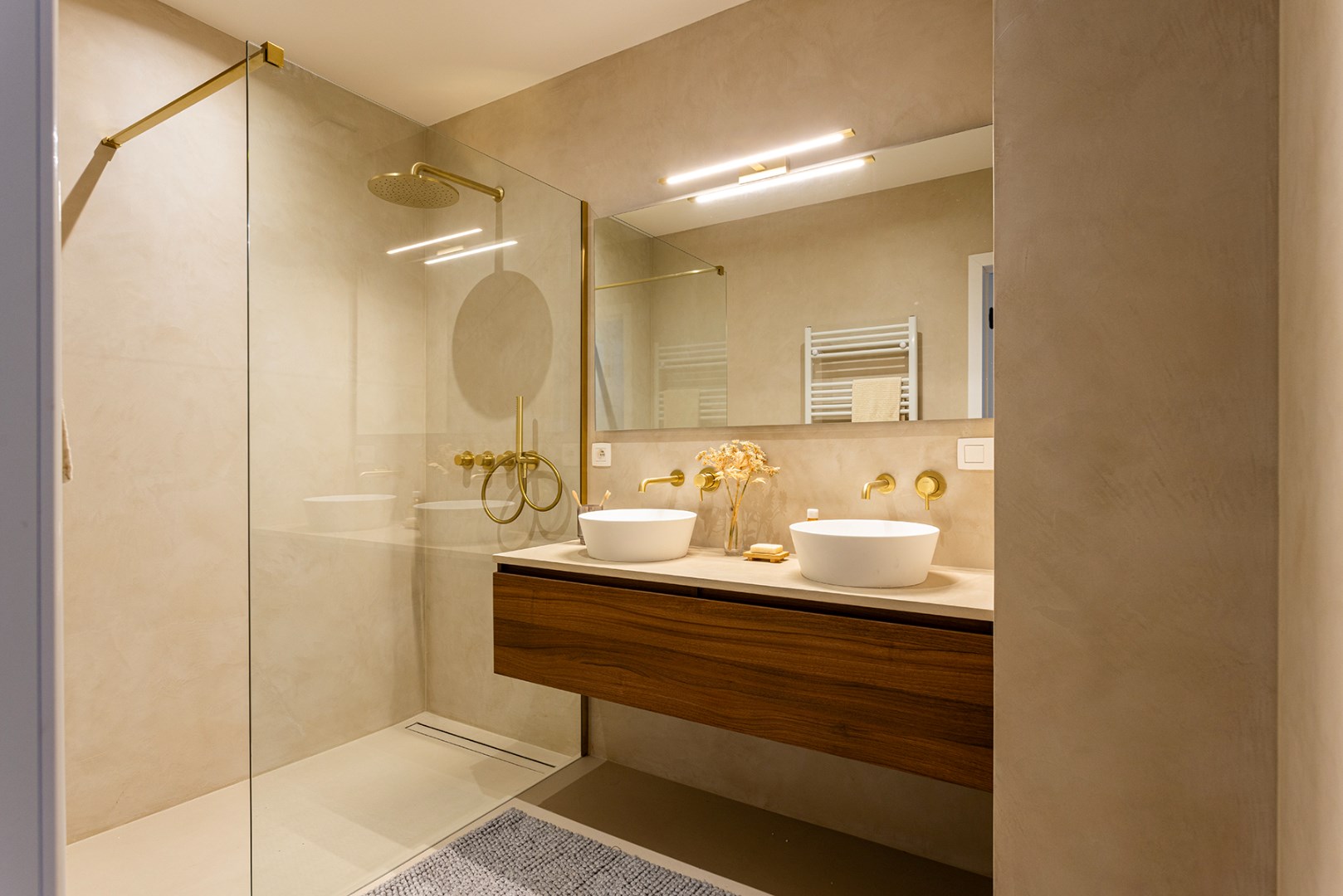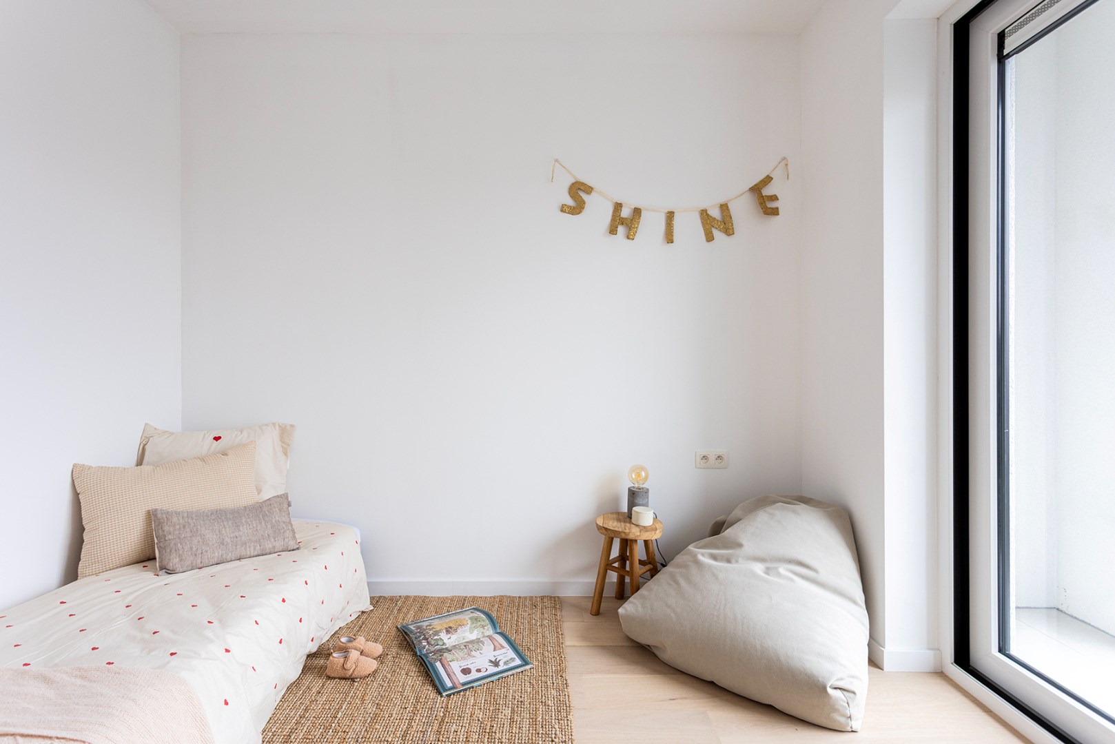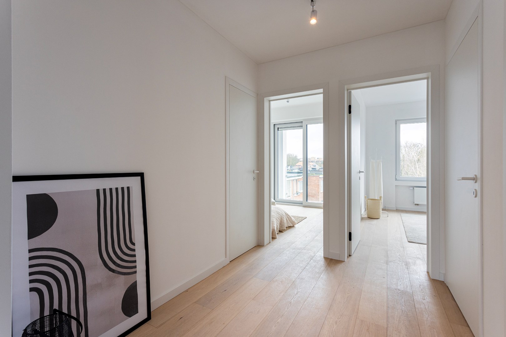 Bij binnenkomst via de inkomhal valt meteen de ruime en doordachte indeling op. Aan de linkerkant ligt de lichte woonkamer, die naadloos overgaat in een moderne open keuken, volledig uitgerust met comfortabele inbouwtoestellen en een extra berging. Vanuit de hal is ook de stijlvolle badkamer bereikbaar, voorzien van een inloopdouche en een meubel met dubbele wastafels. Daarnaast is er een apart toilet en zijn er twee slaapkamers, waarvan één directe toegang biedt tot een gezellig terras.