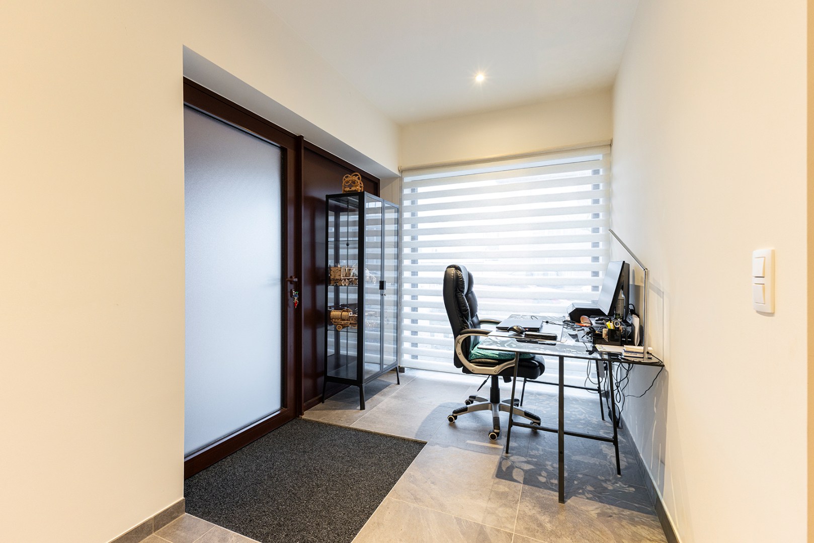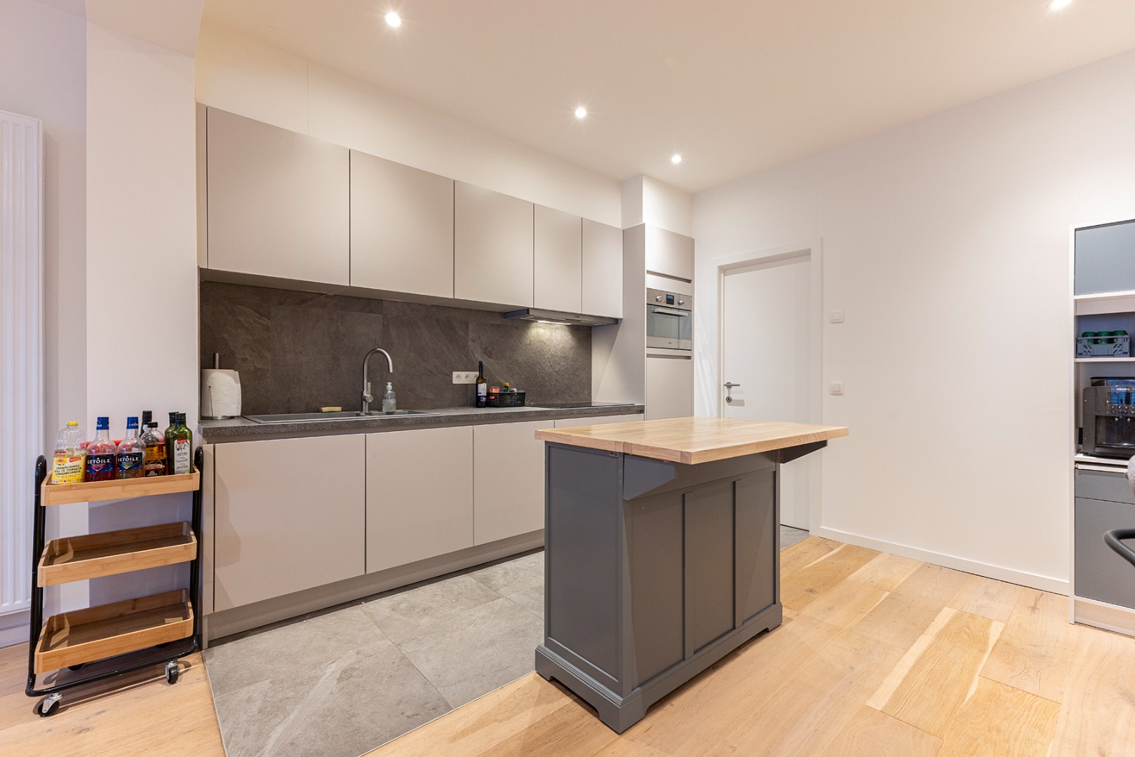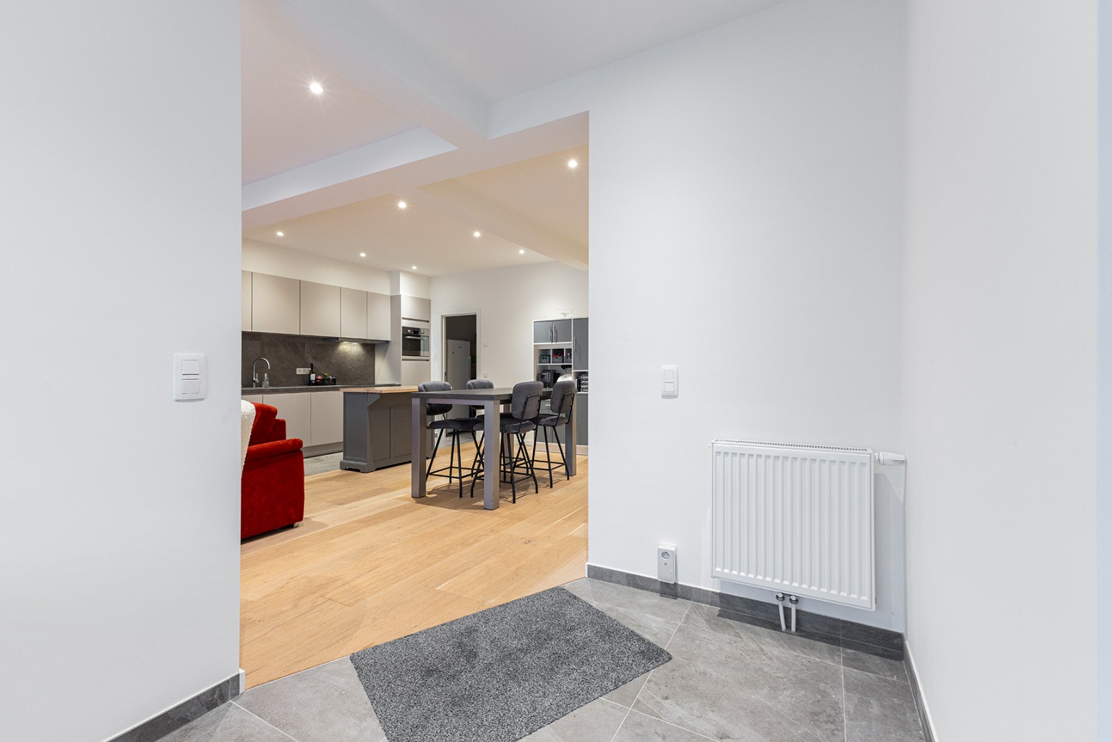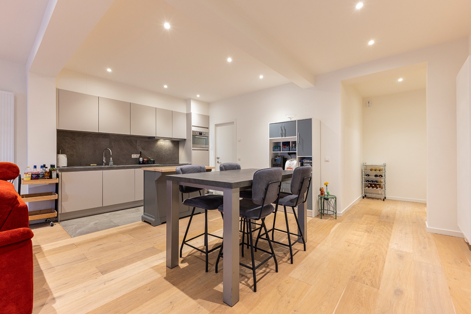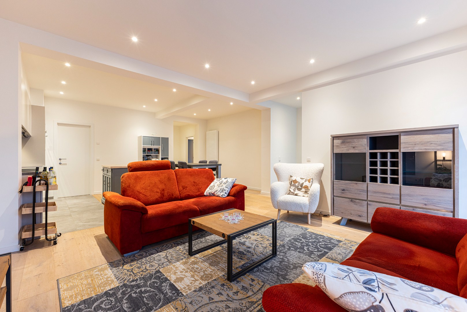 Het appartement heeft een aparte inkomdeur die direct toegang geeft aan een eerste ruimte die momenteel ingericht is als bureau. Verder komt u binnen in de lichtrijke grote woonkamer met open moderne keuken. Aanpalend aan de keuken is er een berging. Verder zijn er twee aparte slaapkamers waarvan één met ensuite-badkamer met inloopdouche en enkele lavabo. De derde kamer is een doorloopkamer die toegang geeft aan de grote slaapkamer en de koer achteraan. Er is ook nog een tweede badkamer met douche en enkele lavabo.