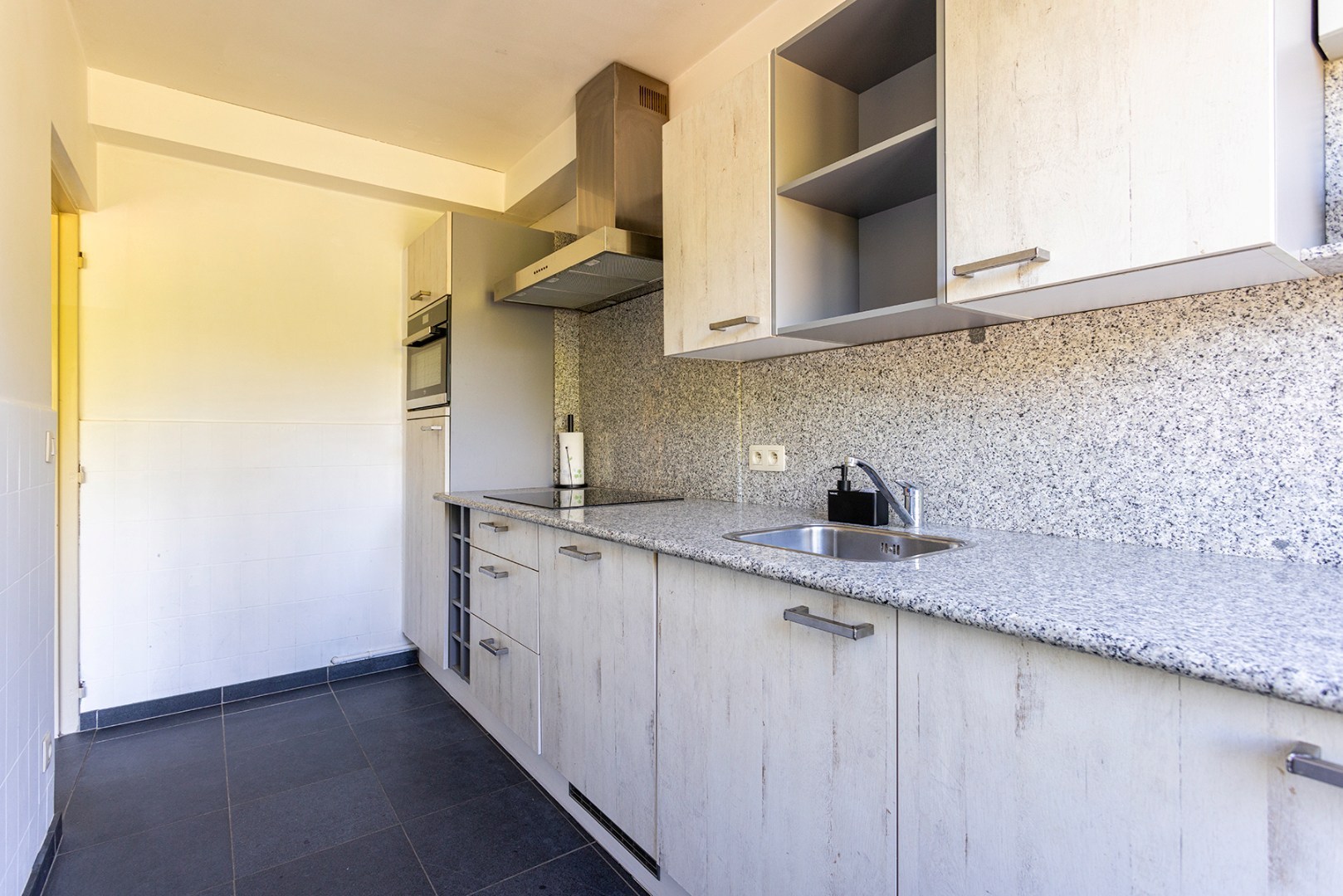 U komt binnen in een centraal gelegen inkomhal, waarlangs u de woonkamer, het apart toilet, de badkamer met regendouche, een berging met de aansluiting voor wasmachine en droogkast en de twee slaapkamers kan bereiken. Langs de woonkamer betreedt u de keuken. Deze laatste is volledig uitgerust met toestellen van Beko en een granieten werk- en spatwand. De twee slaapkamers liggen rustig aan de achterkant van het appartement en langs de tweede slaapkamer kan u een overdekt, zuid georiënteerd terras terugvinden. Het appartement is voorzien van een doorlopende granieten vloer. Met als kers op de taart heeft u zowel langs de woonkamer als de keuken zicht op het groen!