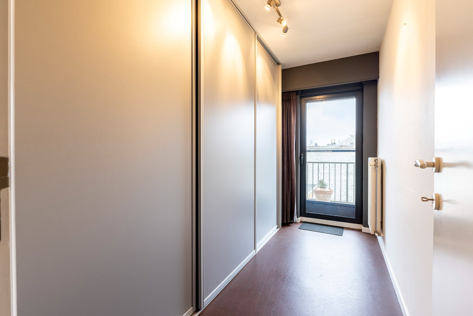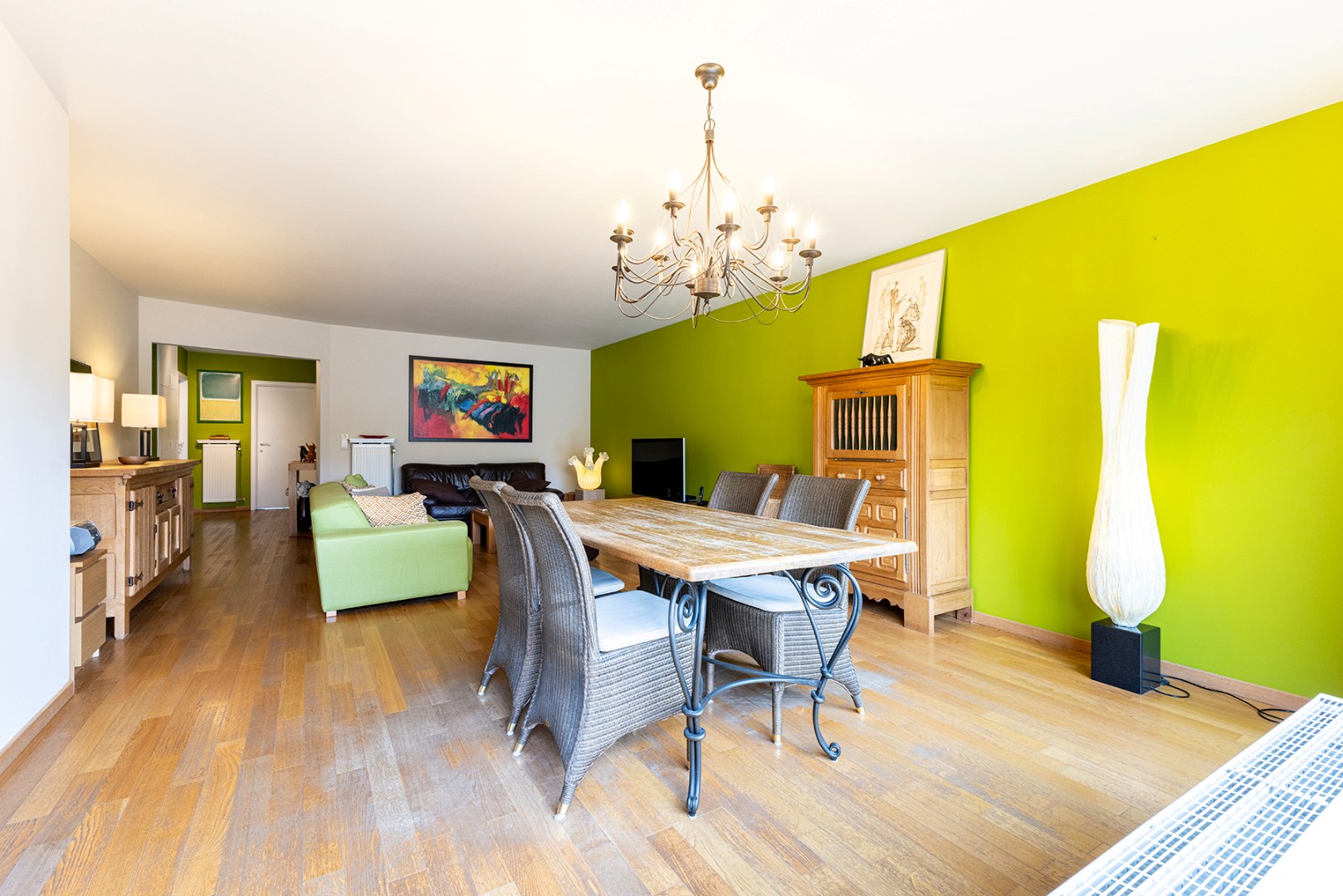 U komt binnen via de centrale inkom met vestiaire. Vooraan is er de lichtrijke woonkamer (36m²), waarvan de parketvloer zorgt voor extra gezelligheid en warmte. Ook heeft u vooraan een terras over bijna de gehele lengte van het gebouw. Naast de woonkamer bevindt zich de keuken, voorzien van alle toestellen voor het nodige comfort. Achterin de keuken is er een ruime berging, waar er een aansluiting is voor een wasmachine en/of droogkast. Centraal is er de badkamer (8m²) met inloop/regendouche en een dubbele lavabo met spiegel verwerkt in een badkamermeubel. Verder zijn er 3 slaapkamers (15m², 9m² en 7.5m²), waarvan de kleinste slaapkamer doorgang geeft aan het terras achteraan.
