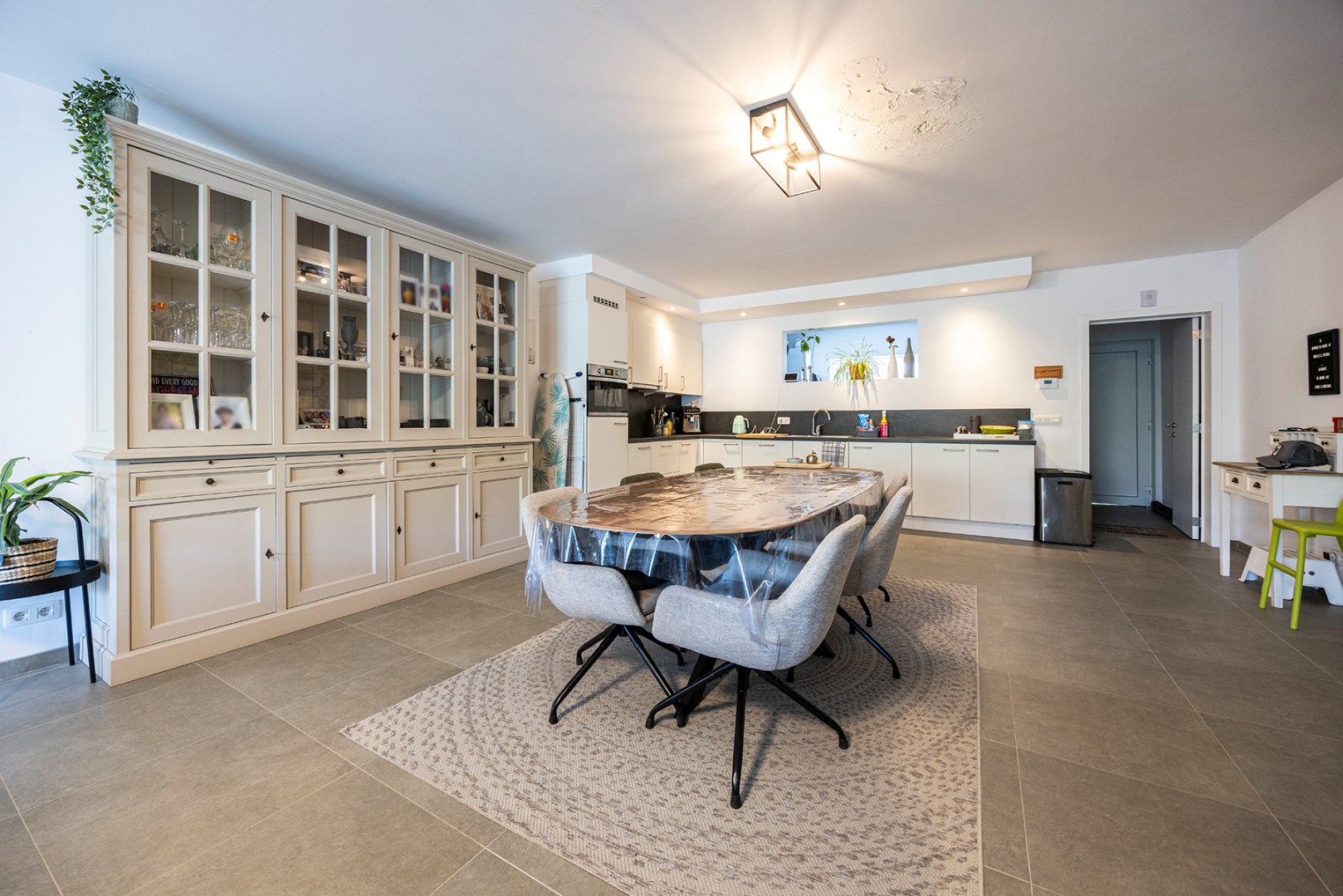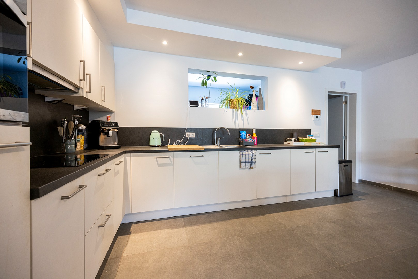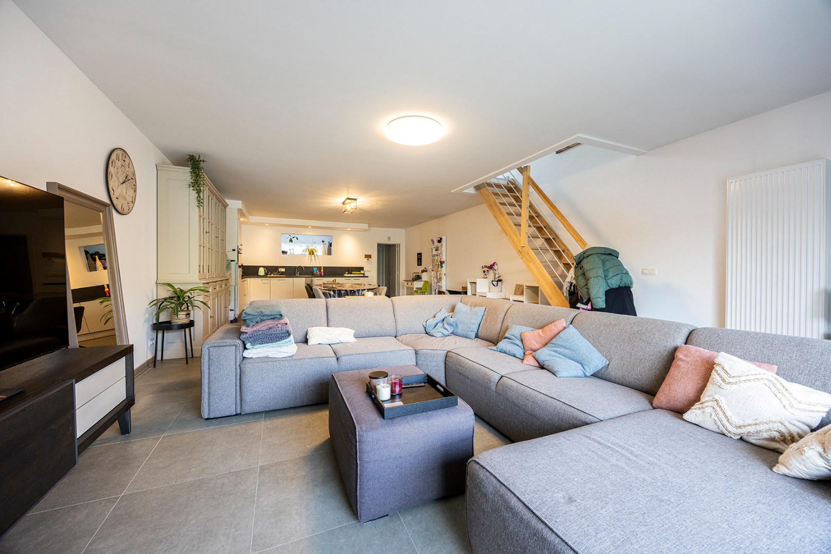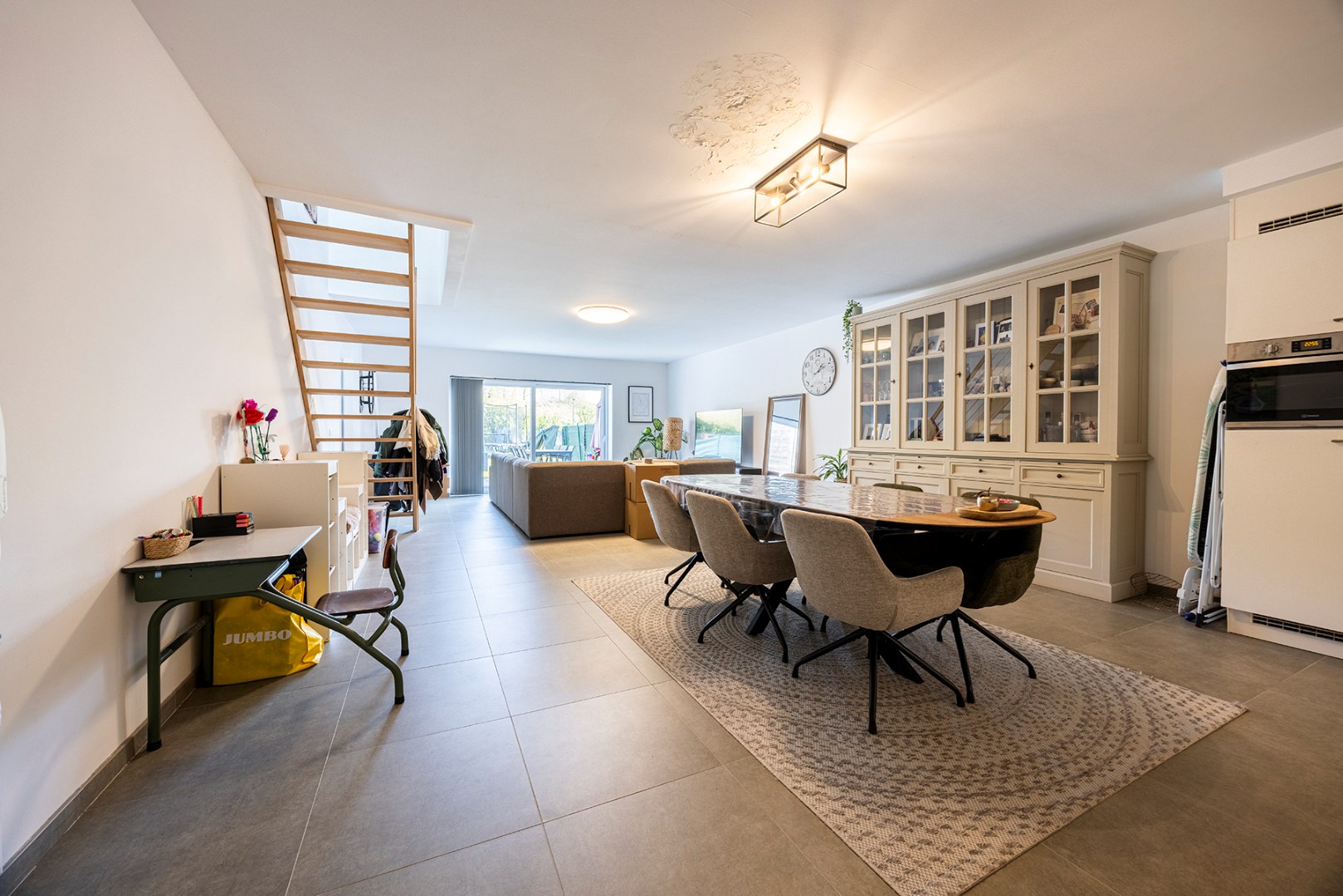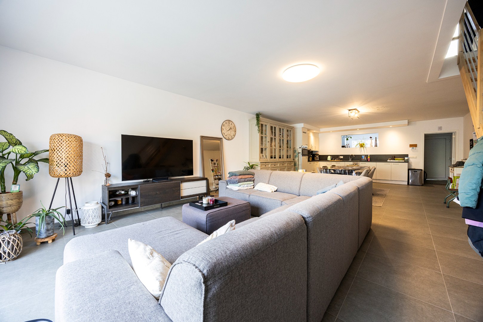 U betreedt de woning via de aparte inkomhal, die achteraan toegang geeft tot de enorm ruime woonkamer met open keuken. De keuken beschikt, naast veel opbergruimte, over een afwasmachine, koelkast met vriesvak, oven, kookplaat en enkele spoelbak. Via de trap in de woonkamer kan u de eerste verdieping bereiken.