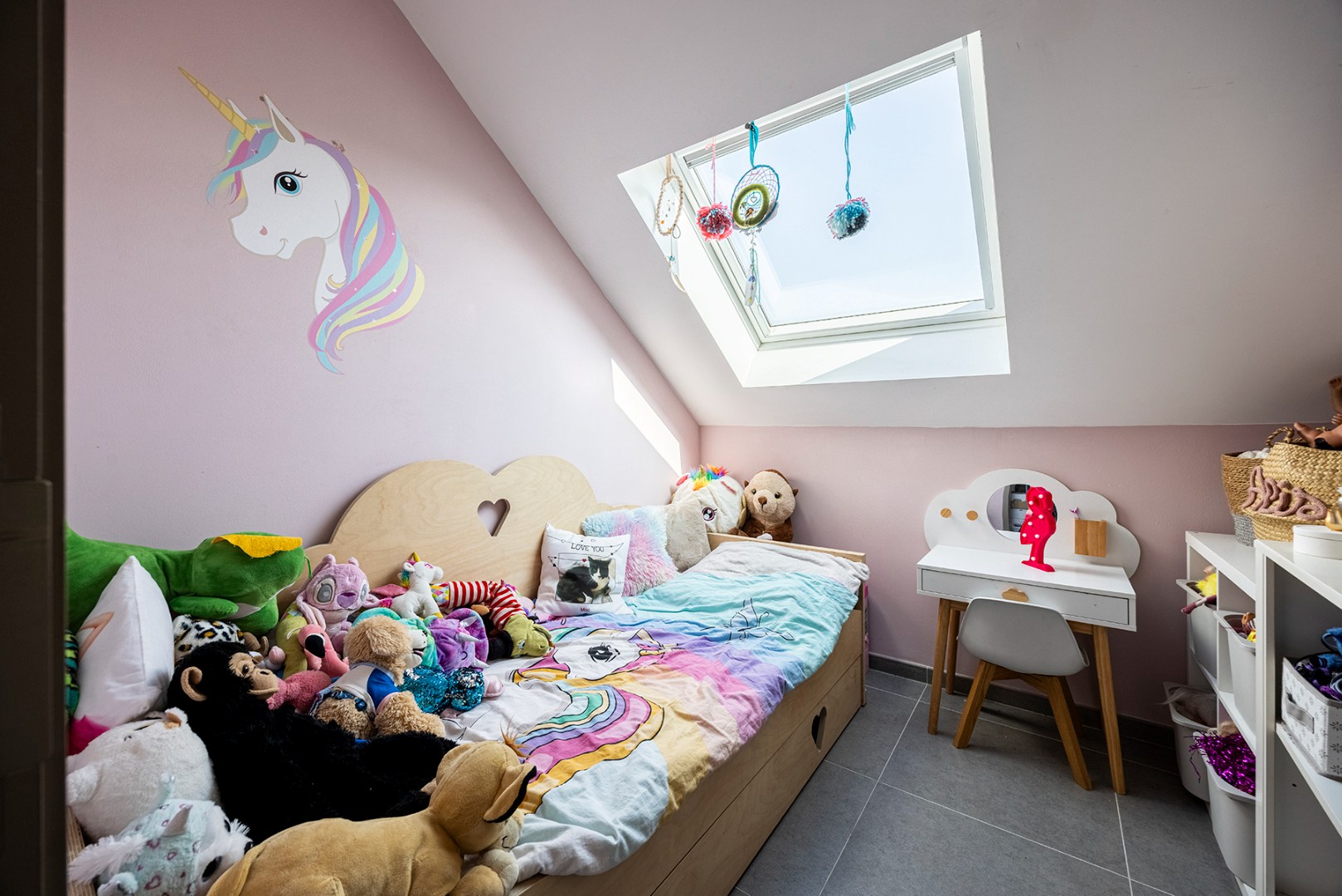 Op de eerste verdieping vindt u de drie ruime slaapkamers, alsook de volledig uitgeruste badkamer met inloopdouche en toilet.