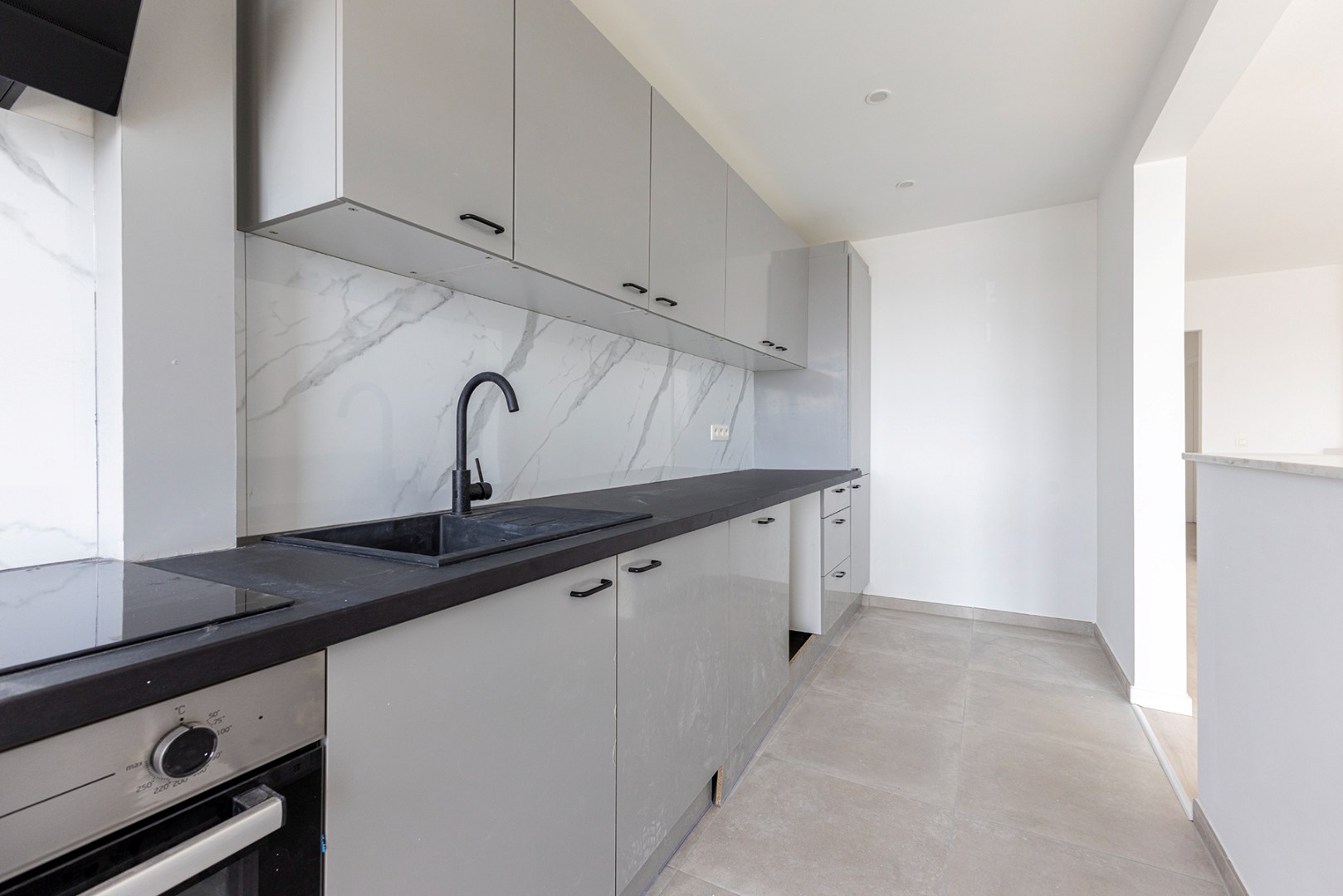 De splinternieuwe keuken met compact balkon is voorzien van oven, inductiekookplaat, vaatwasser, dampkap, koelkast, diepvries en aansluiting voor een wasmachine.