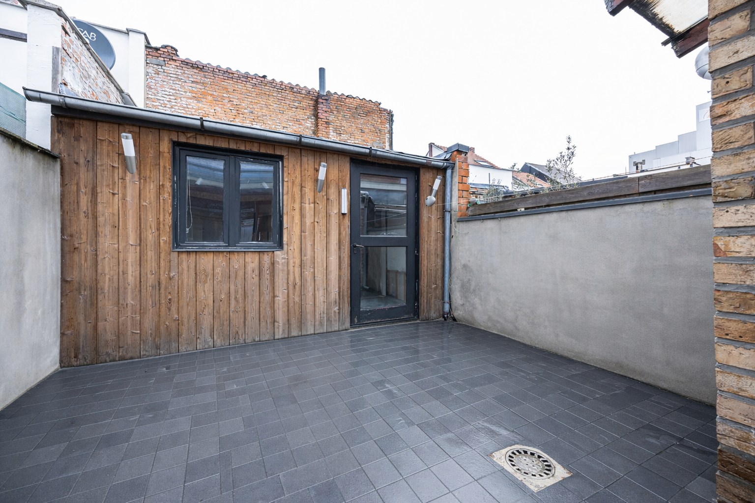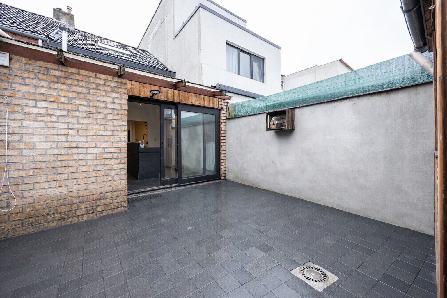 Via de schuifdeur betreden we de koer (16m²) met een groot tuinhuis (12m²). Ideaal als atelier of hobbyruimte, hier is aansluiting wasmachine en droogkast voorzien.
