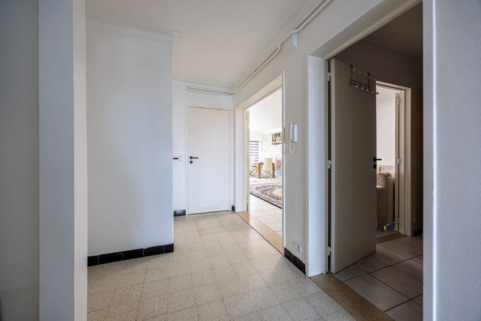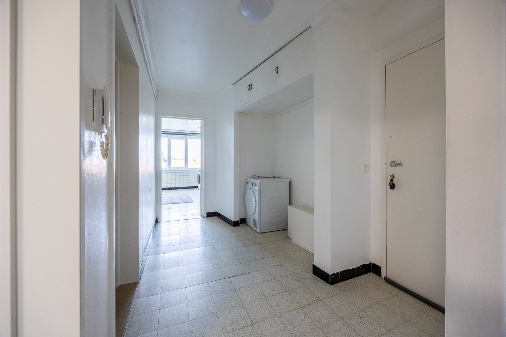 U betreedt het appartement via een centrale inkomhal die op zijn beurt doorgang geeft aan een grote woonkamer (34m²), een badkamer met douche, een apart toilet, een ruime keuken (14m²) en een grote slaapkamer (20m²). Langs de woonkamer kan u de tweede slaapkamer (9m²) bereiken. Tot slot geven zowel de keuken als de eerste slaapkamer doorgang aan een Westgericht terras. Ideaal om 's avonds met het zonnetje op uw gezicht te zitten.