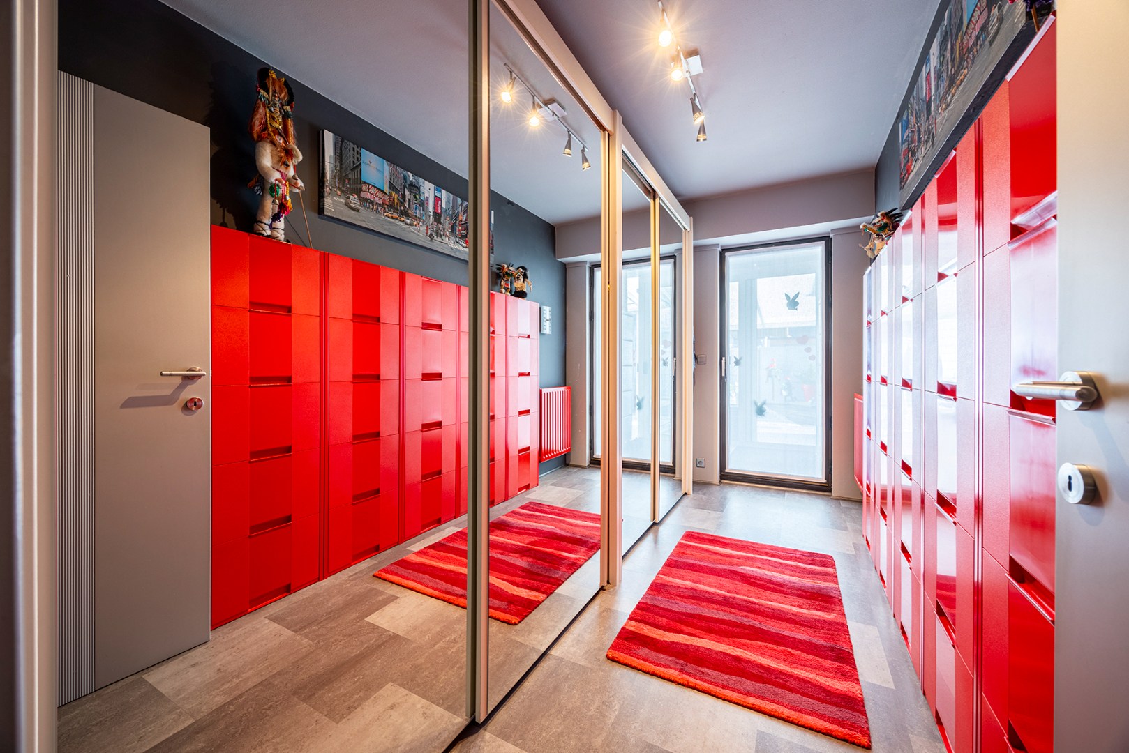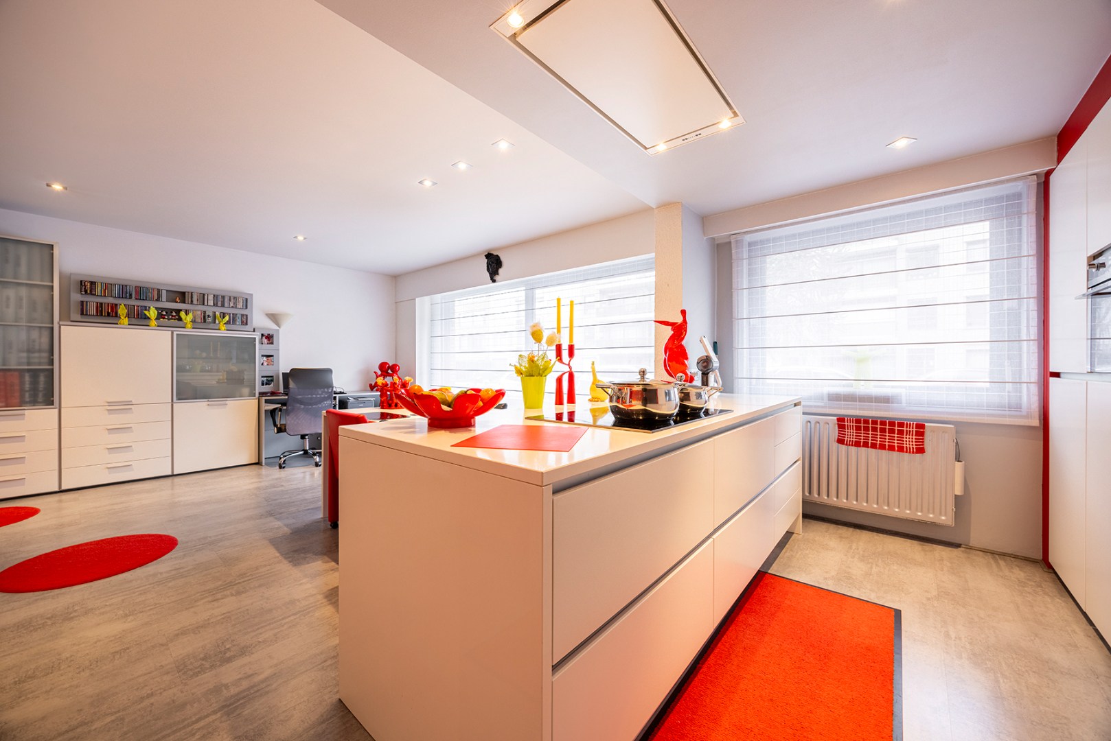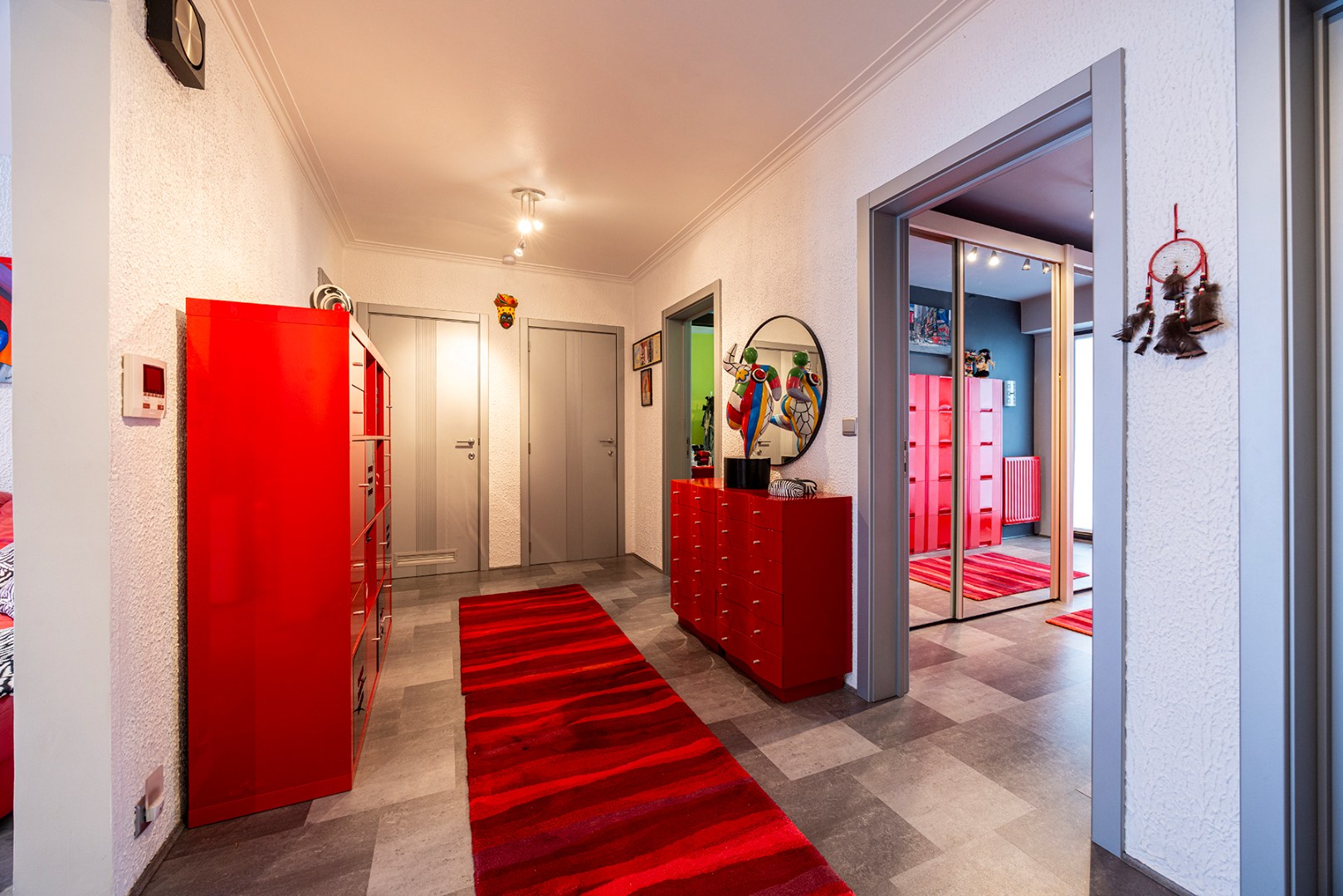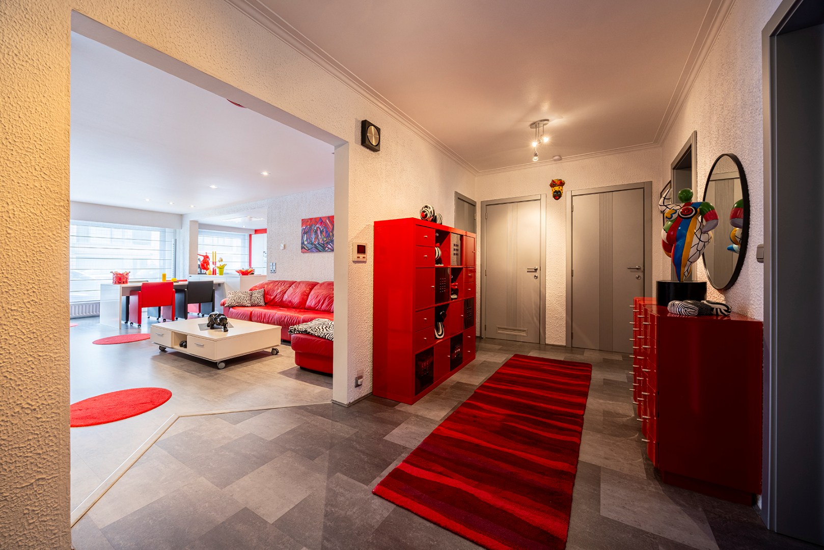 U betreedt het appartement via een ruime inkomhal met vestiairekast. Deze is centraal gelegen en geeft doorgang aan de woonkamer, een moderne badkamer met inloopdouche, dubbele spoelbak verwerkt in meubel en een apart toilet. Langs de grote woonkamer (35m²) vindt u de hypermoderne, open keuken (12m²). Deze laatste is voorzien van een inductiekookplaat, een dampkap van Novy, een oven en microgolfoven, koelkast en diepvries, vaatwasser en een enkele spoelbak, alsook de aansluiting voor de wasmachine. Aan de achterzijde van het appartement situeren zich drie slaapkamers (19m², 11m² en 8m²), waarvan de middelste doorgang geeft aan de veranda (23m²). Vervolgens betreedt u een Oostgerichte tuin (47m²). Hierlangs kan u de achterliggende garage terugvinden. De slaapkamers zijn voorzien van ingemaakte kasten.