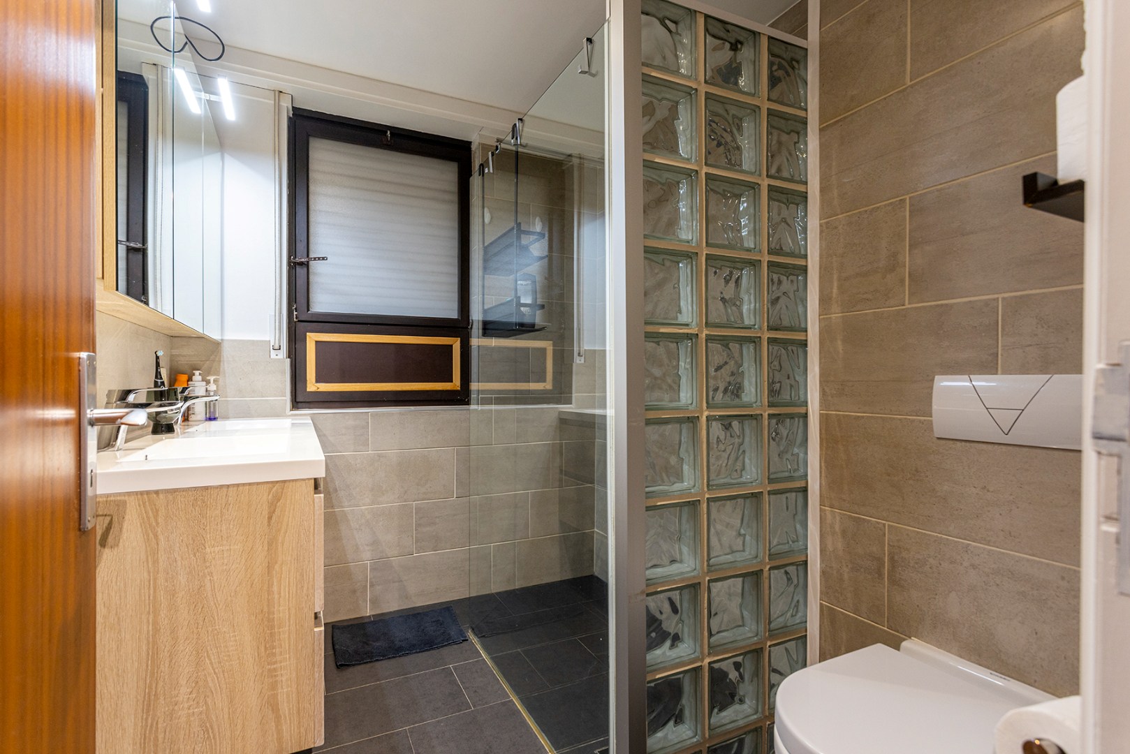 Centraal in het appartement vindt u de badkamer met inloopdouche, dubbele lavabo met bijhorend meubel, en toilet.