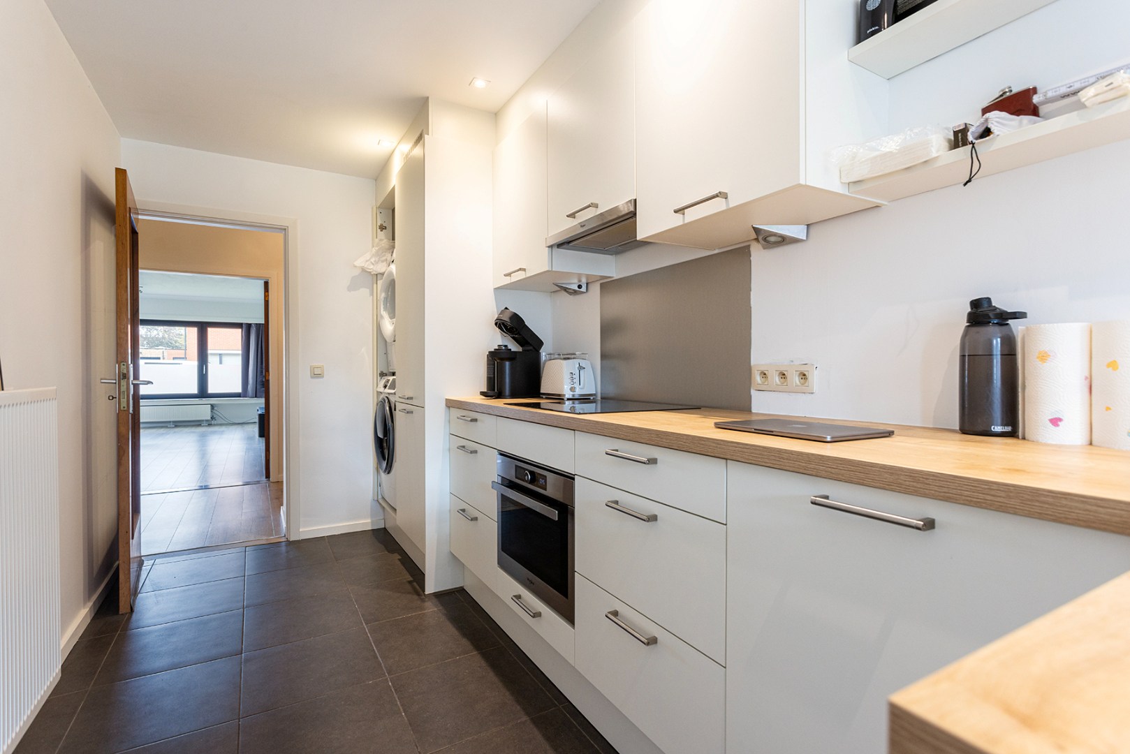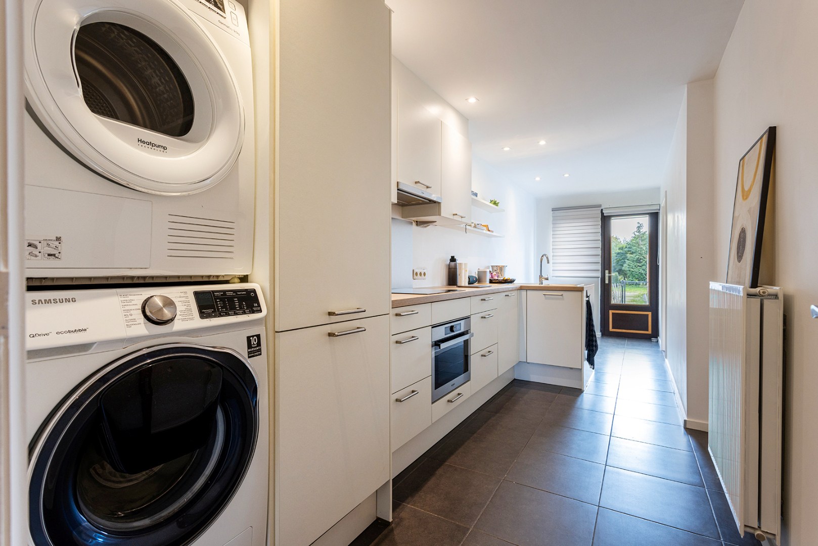 Aansluitend bevindt zich de aparte ingerichte keuken met voldoende bergruimte, voorzien van een kookplaat, dampkap, oven, spoelbak, vaatwasser, koelkast en aansluiting wasmachine en droogkast. Via de keuken heb je toegang tot de privé tuin.